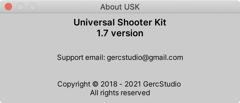 Hello! Here you can see the detailed documentation for the Universal Shooter Kit. If you have any questions, feel free to write on the [**Forum**](https://forum.unity.com/threads/v-1-6-1universal-shooter-kit-fps-tps-tds.596497/#post-3986848), [**Discord server**](https://bit.ly/gs-discord), or by email: [**gercstudio@gmail.com**](mailto:gercstudio@gmail.com?subject=Universal%20Shooter%20Kit%20-%20Question%20) 🙂